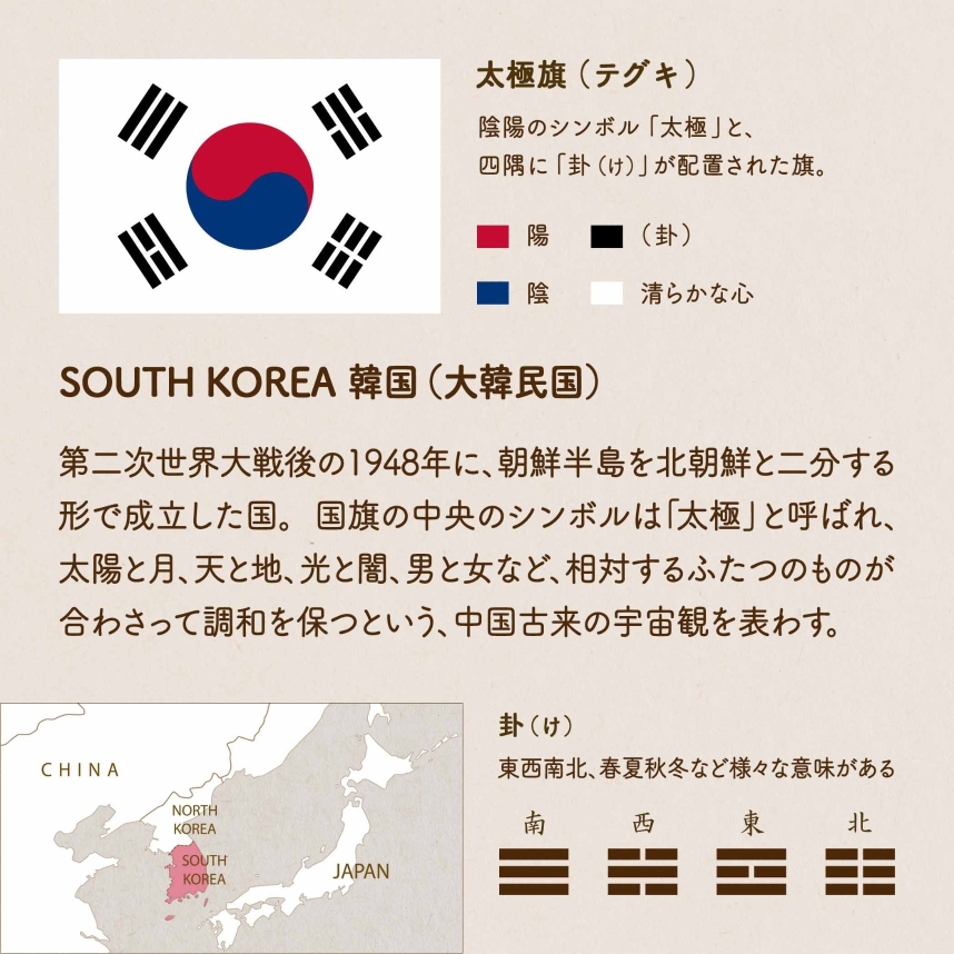 この太極旗があらわしているのは、中国古来から伝わる宇宙・万物の真理。実はとても哲学的な国旗です。