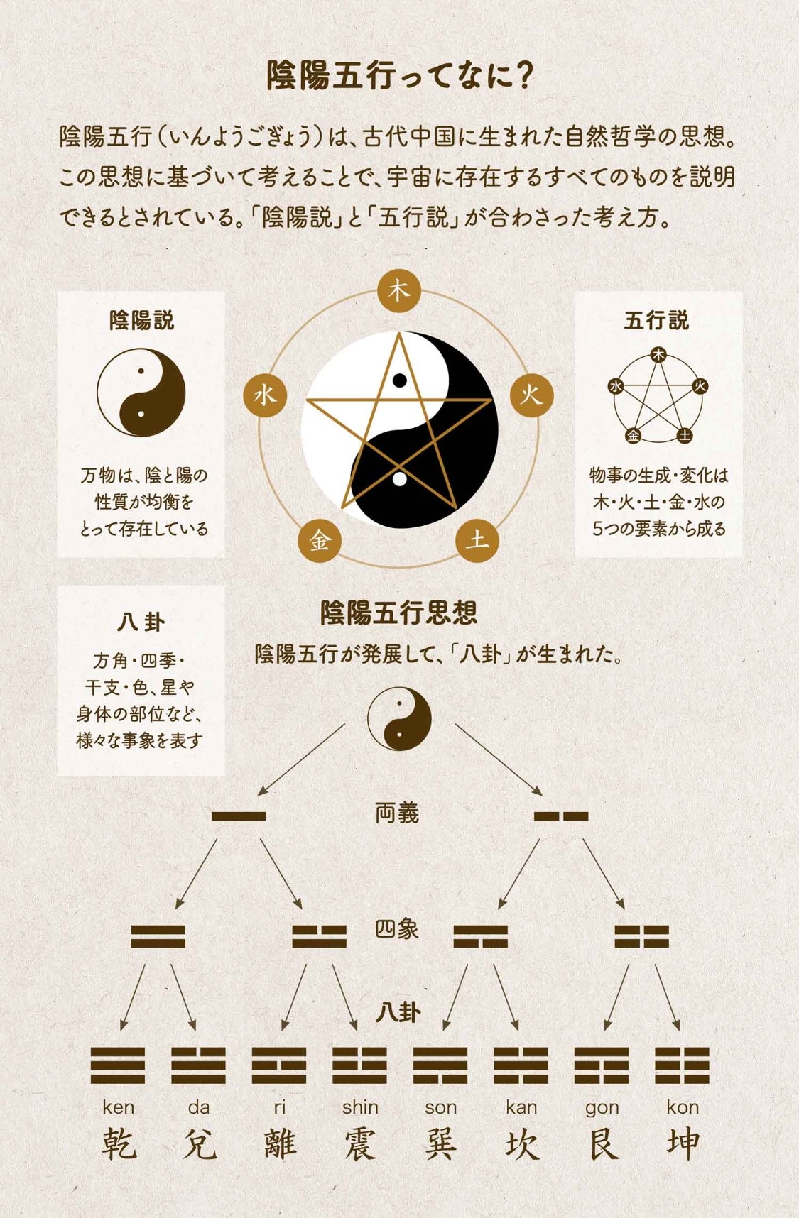 陰陽説は、宇宙のありとあらゆる物事は、相反する陰と陽の2つの「気」の働きによって成り立ち、お互いにバランスをとって存在しているという考え方。五行説は、木・火・土・金・水の5つの要素が、「相生(そうしょう)」と「相剋(そうこく)」の関係でお互いに影響し合うという考え方です。