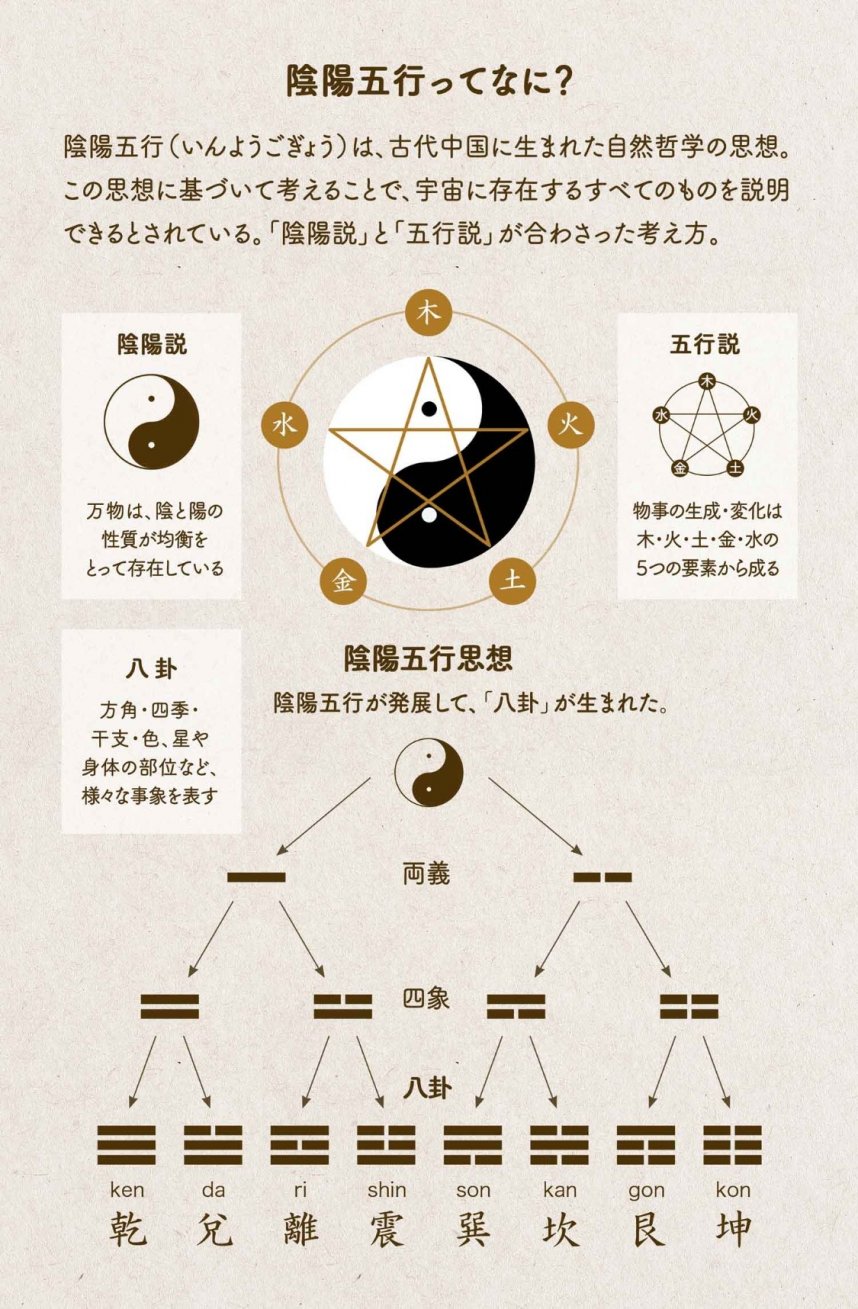 この陰陽説と五行説が合わさったことにより、宇宙に存在するすべての物事を説明できるとされています。