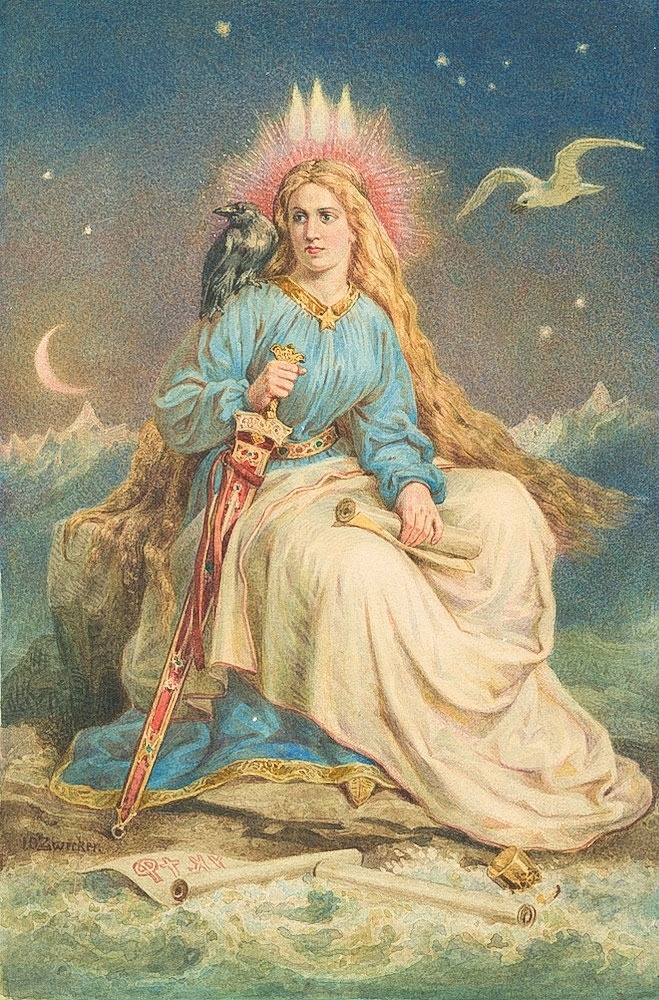 彼女の頭には氷の冠があり、そこから火が噴き出しています。彼女の肩には、北欧神話の主神にして戦争と死の神オーディン(詩文の神でもあり、また吟遊詩人のパトロンでもあり、魔術に長け、知識に対し非常に貪欲)の古代の友人であるカラスが止まっています。