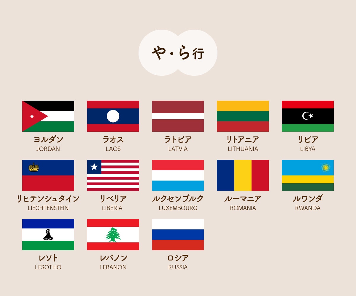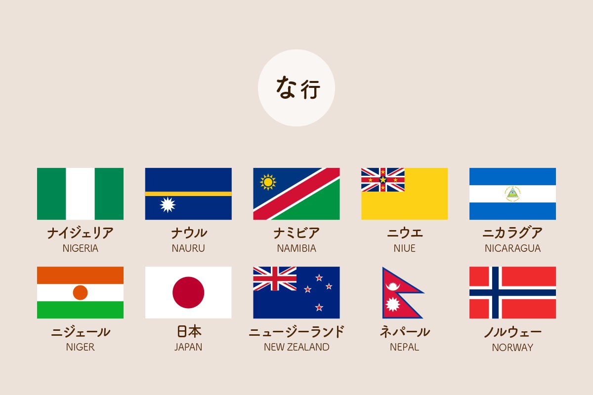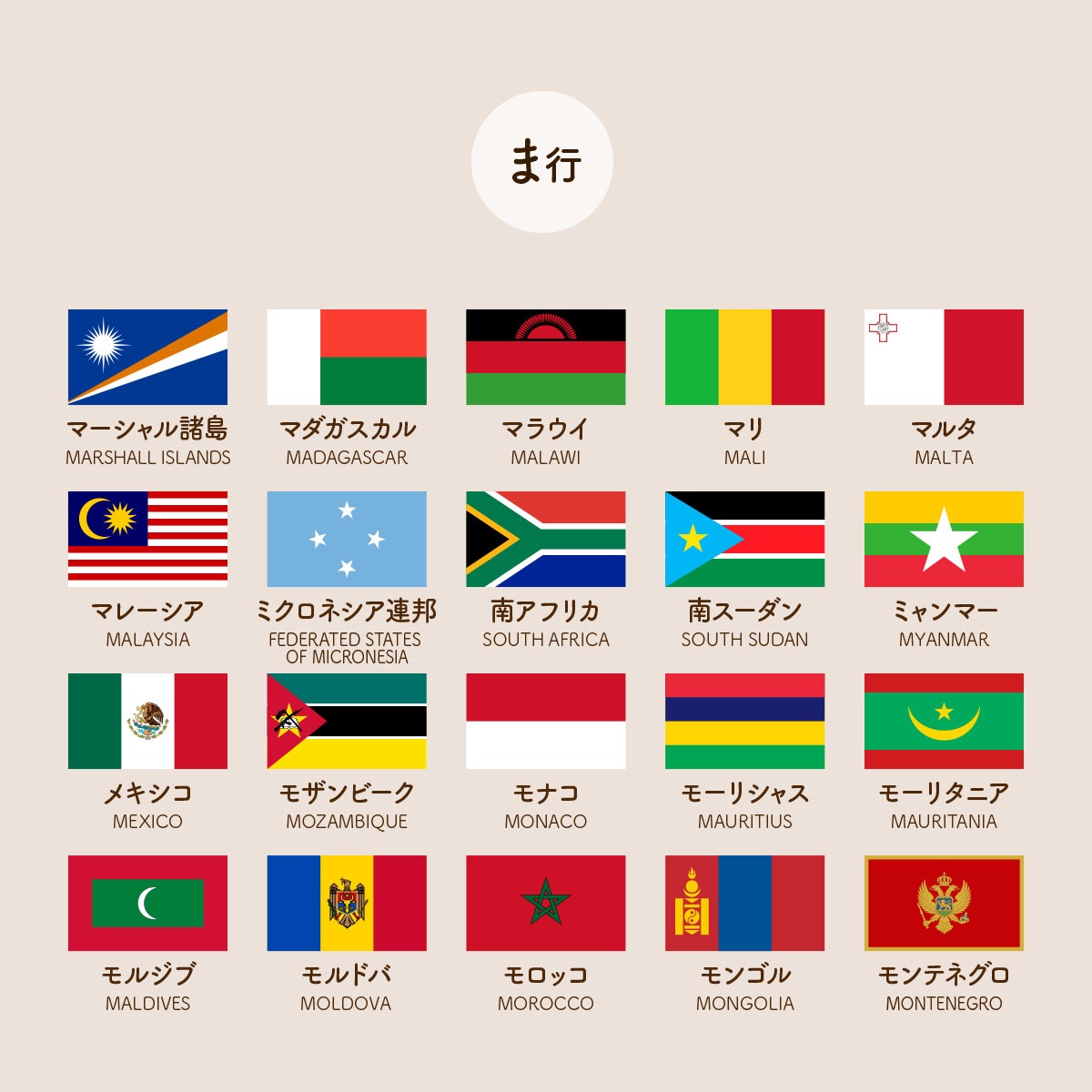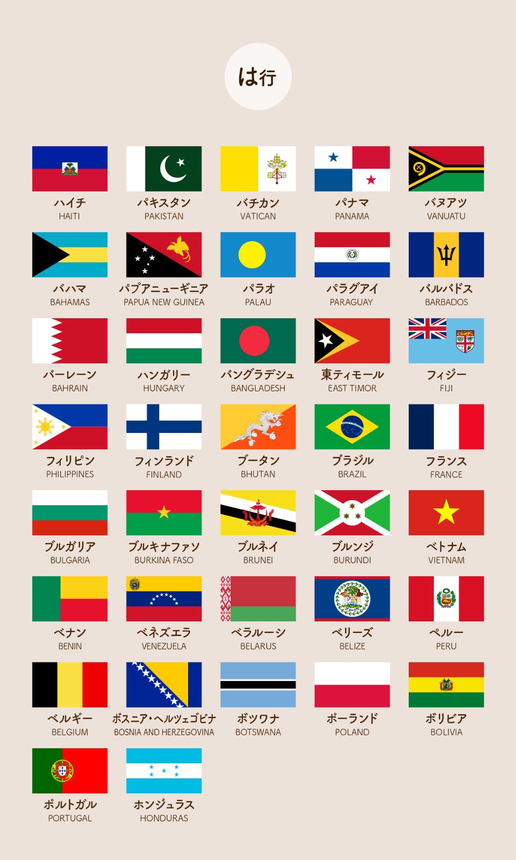 ※長方形・正方形の国旗は、縦横比を全て3:5に統一しています。※ 英国(グレートブリテン及び北アイルランド連合王国)は「イギリス」としてあ行に掲載しています。